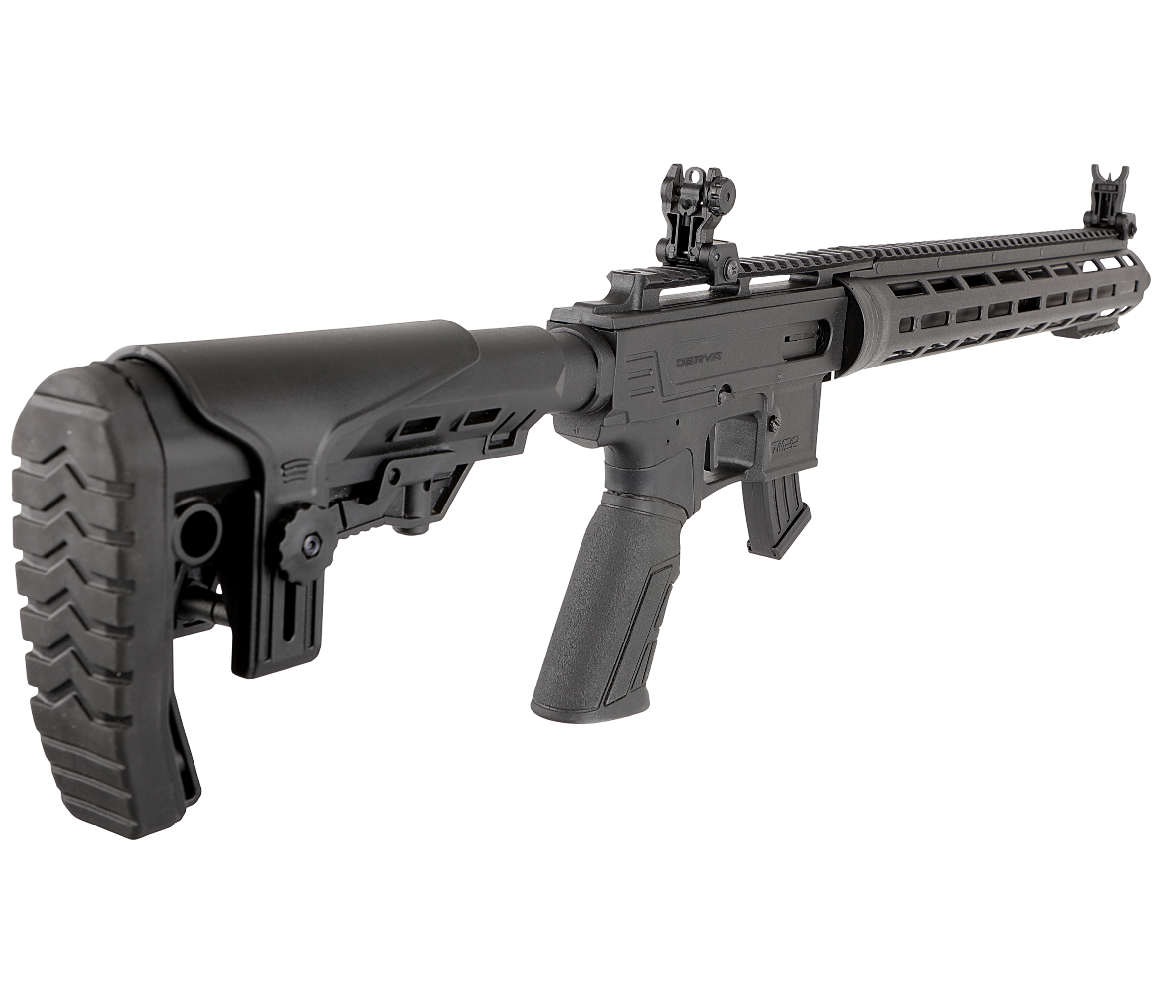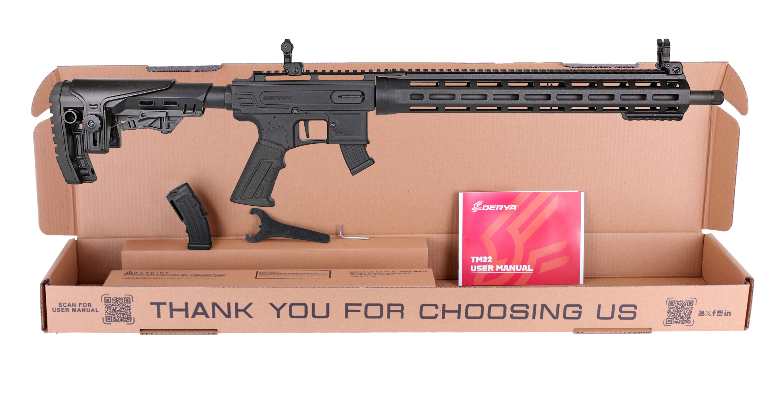 Experience "Fast and Faster" with the Derya TM22 FLASH 22lr Rifle—a lightweight, precision-driven firearm engineered for rapid handling and unmatched speed in every shot. Featuring an 18" rifled target barrel, this sleek powerhouse is perfect for shooters craving accuracy, versatility, and lightning-quick performance. At just 4.85 lbs (unloaded) and 34" overall, it boasts a semi-auto action for fast follow-ups, a positive thumb safety, and an adjustable stock with AR-type grip for a custom, ergonomic fit that keeps you ahead of the action. The full top rail enables seamless optic mounting, paired with flip-up sights for instant readiness, while the M-LOK-equipped forend and Picatinny rail allow for swift accessory swaps, adapting effortlessly to any shooting scenario. Coated in durable black anodized finish with black polymer furniture, flip-up iron sights, and a 13–14.5" length of pull, it delivers comfort and reliability for all users, including a 10-round polymer magazine. Whether plinking, small-game hunting, or dominating range days, the TM22 FLASH is your stylish, enduring companion—built for generations, with aftermarket 15-round and 25-round magazines for even faster, extended sessions.