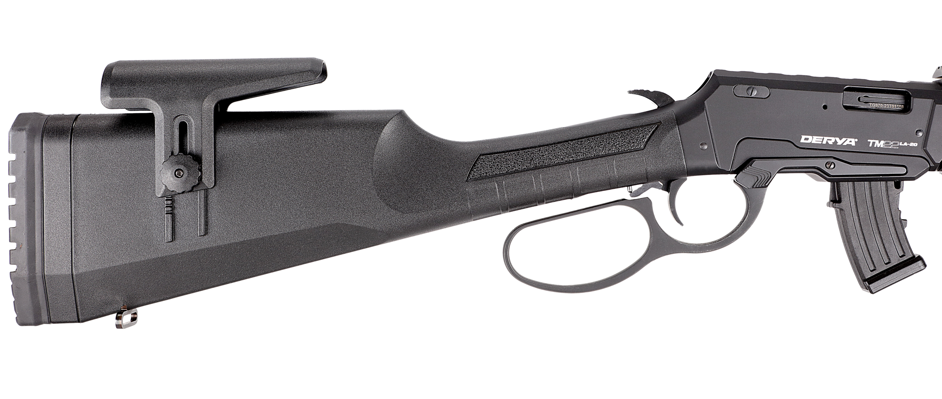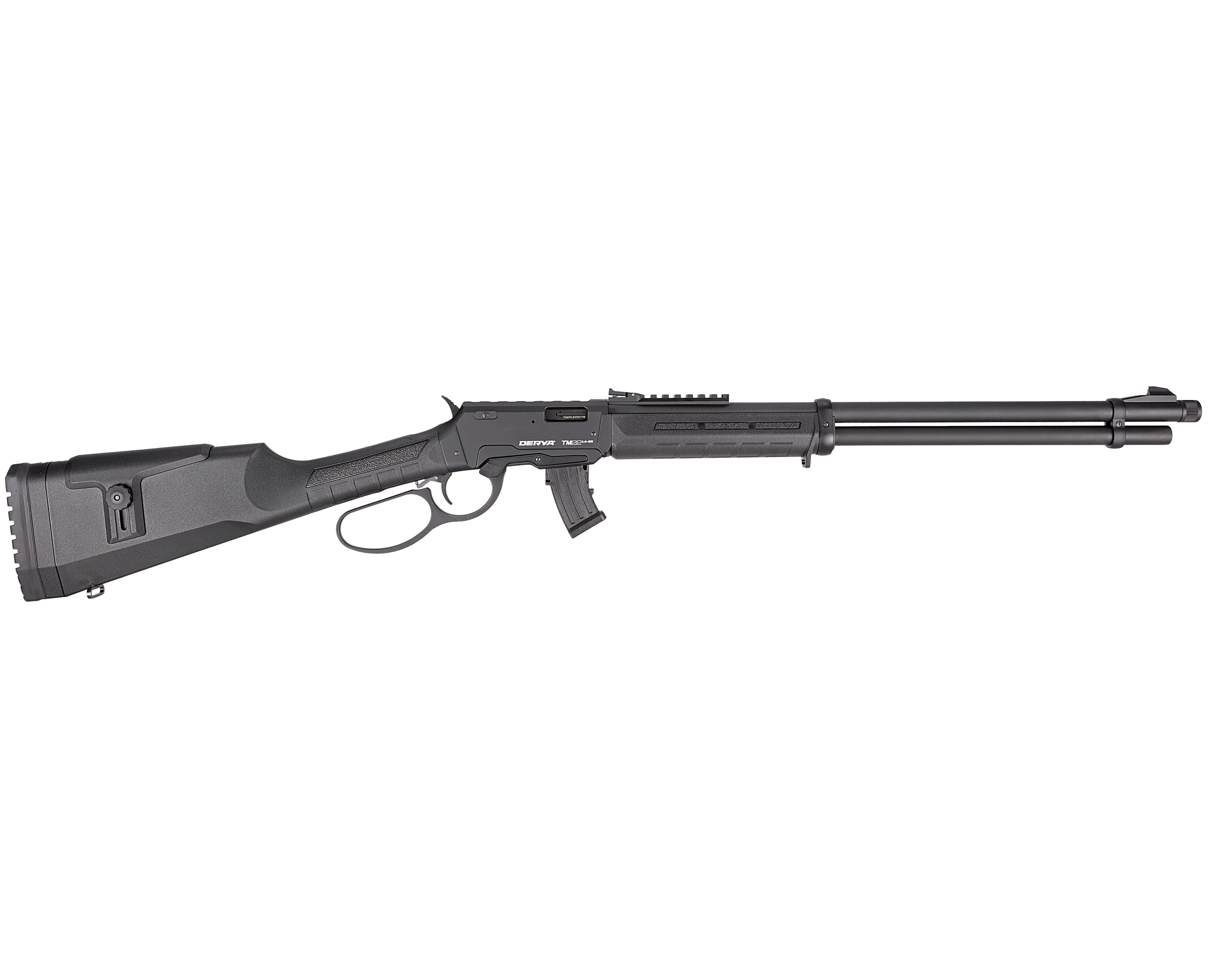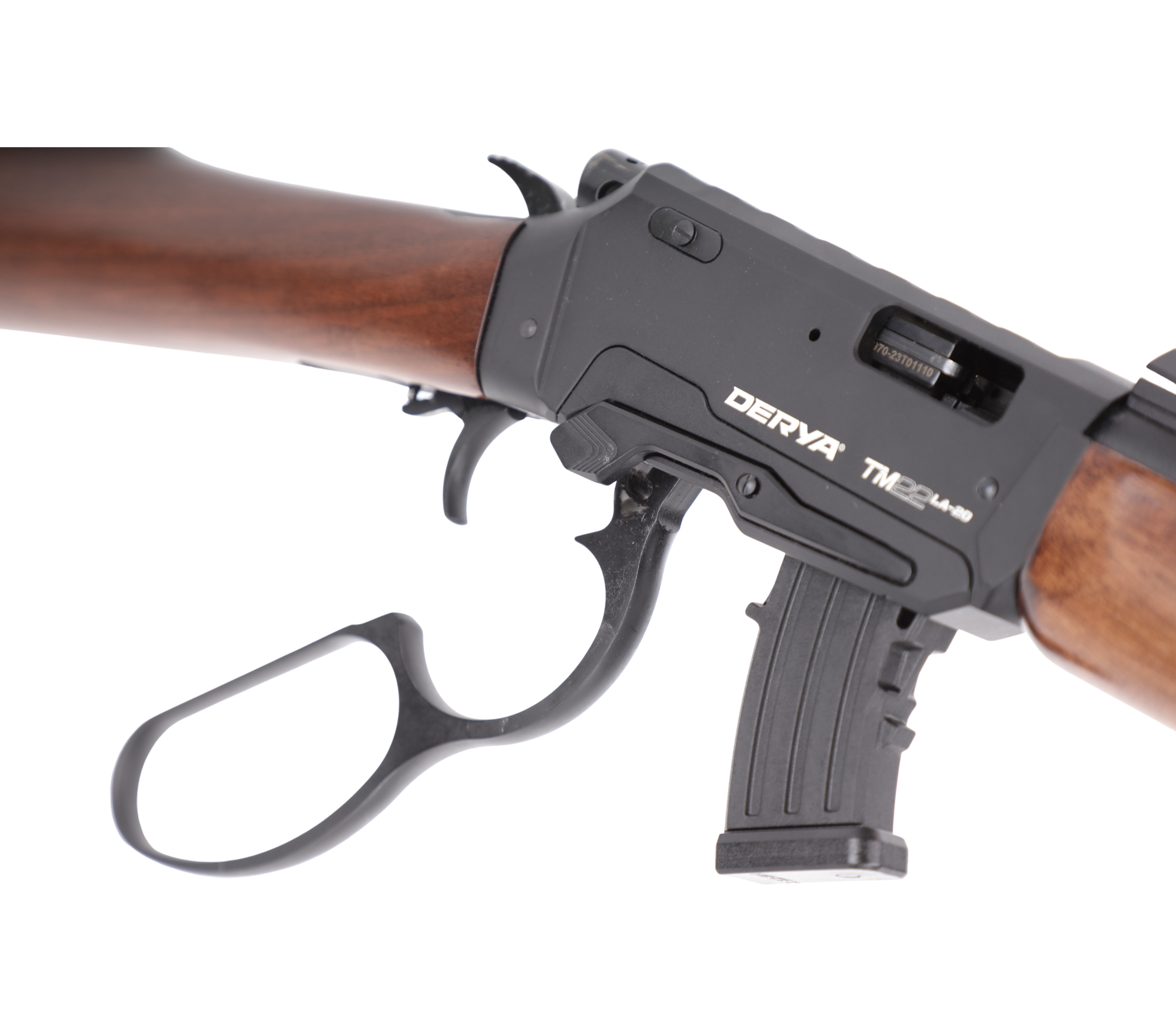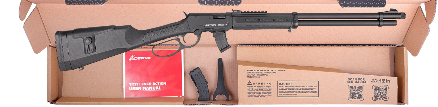 The Derya TM22 Lever 18" 10rd 22lr Rifle redefines the classic lever-action experience with modern innovation, delivering a mag-fed 22lr rifle that’s built to impress. Featuring a 20" rifled target barrel for pinpoint accuracy, this rifle combines a sleek black anodized and black polymer finish with durable polymer furniture, ensuring both style and resilience. At 5.3 lbs (unloaded) and 38" overall, it’s equipped with a top rail for optics, a rear rail with front bead sight, and a buttstock that comes with the ability to add spacers to adjust the length of pull (13.58") for a personalized fit. The lever-action mechanism, paired with a sliding hammer mechanism safety, offers smooth operation for shooters of all ages, while the 10-round polymer magazine provides reliable feeding, with aftermarket 15rd and 25rd magazines available for extended shooting. Perfect for plinking, small-game hunting, or range days, the TM22 Lever is a modern classic designed to perform and built to last for generations.