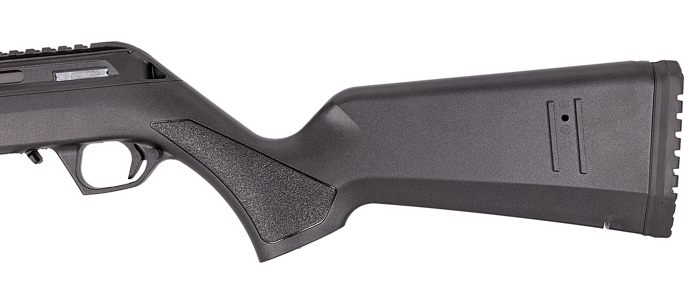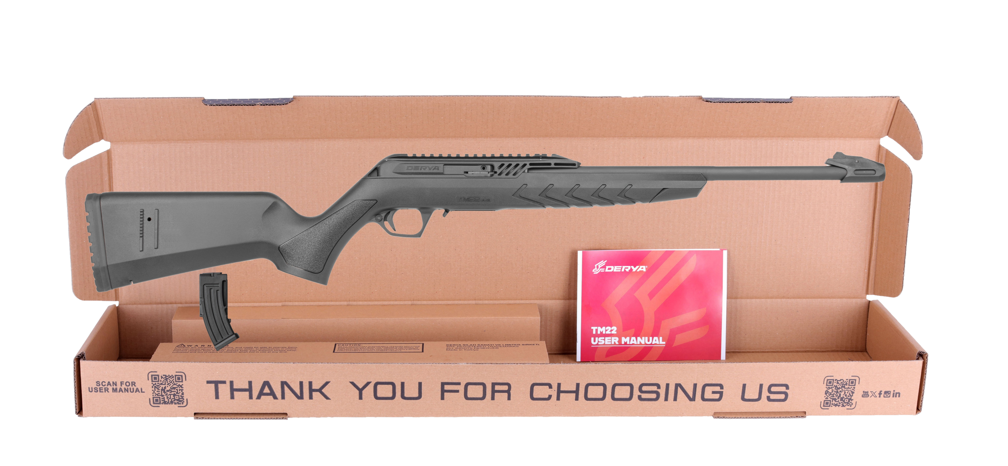 Derya TM22 Standard: always the underdoga modern classic .22LR rifle that seamlessly blends cutting-edge innovation with timeless craftsmanship, proving that reliability and performance don't need the spotlight to shine. Making it the perfect everyday companion for shooters of all ages and generations, it features an 18" target-performance barrel, a 34" overall length, and a modernized adjustable stock with the ability to add or remove basepads to adjust the length of pull, offering a custom fit and versatile performance. Enhanced by a patent-pending front rail, rear rail, and front bead sight for precision targeting, it's built with no shortcuts using black melonite steel parts and a black polymer stock for lightweight durability and enduring style. It comes with a 10-round polymer magazine—plus optional 15- and 25-round aftermarket magazines—delivering reliable fun straight out of the box, whether you’re at the range or passing down a legacy that always comes out on top.